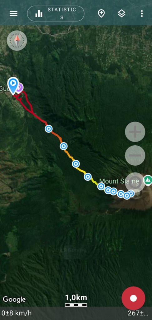 Weh, weh, menarik sekali ini. Saya sudah kehilangan orientasi bahkan sebelum masuk trek pendakian. Maka saya telponlah Obenk. Tak diangkat. Sekali lagi, tak diangkat juga. Saya WA, terkirim tapi tak terbaca—tentu saja.