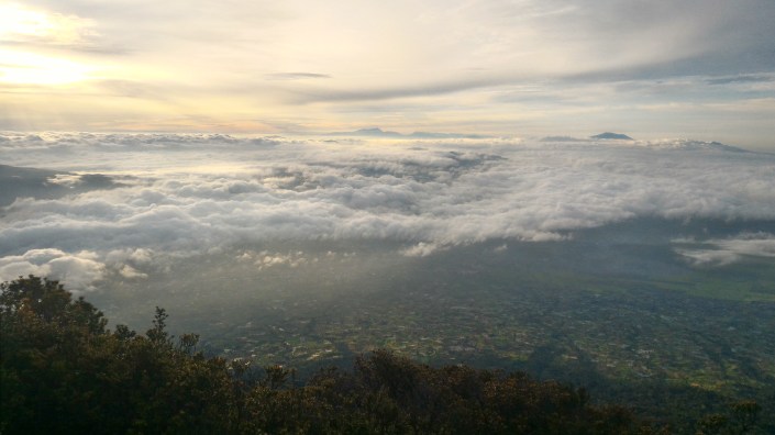 Lalu setelah memanjat akar-akar pohon dan sampai di atasnya, saya tiba di tanah terbuka, dengan hanya semak dan perdu setinggi lutut. Pemandangan luas terhampar. Di depan saya puncak Kerinci menjulang. Ketika saya berbalik, matahari yang baru terbit menyinari hamparan awan dan lereng dan tetumbuhan. Kami semua bermandi cahaya di atap Sumatera.