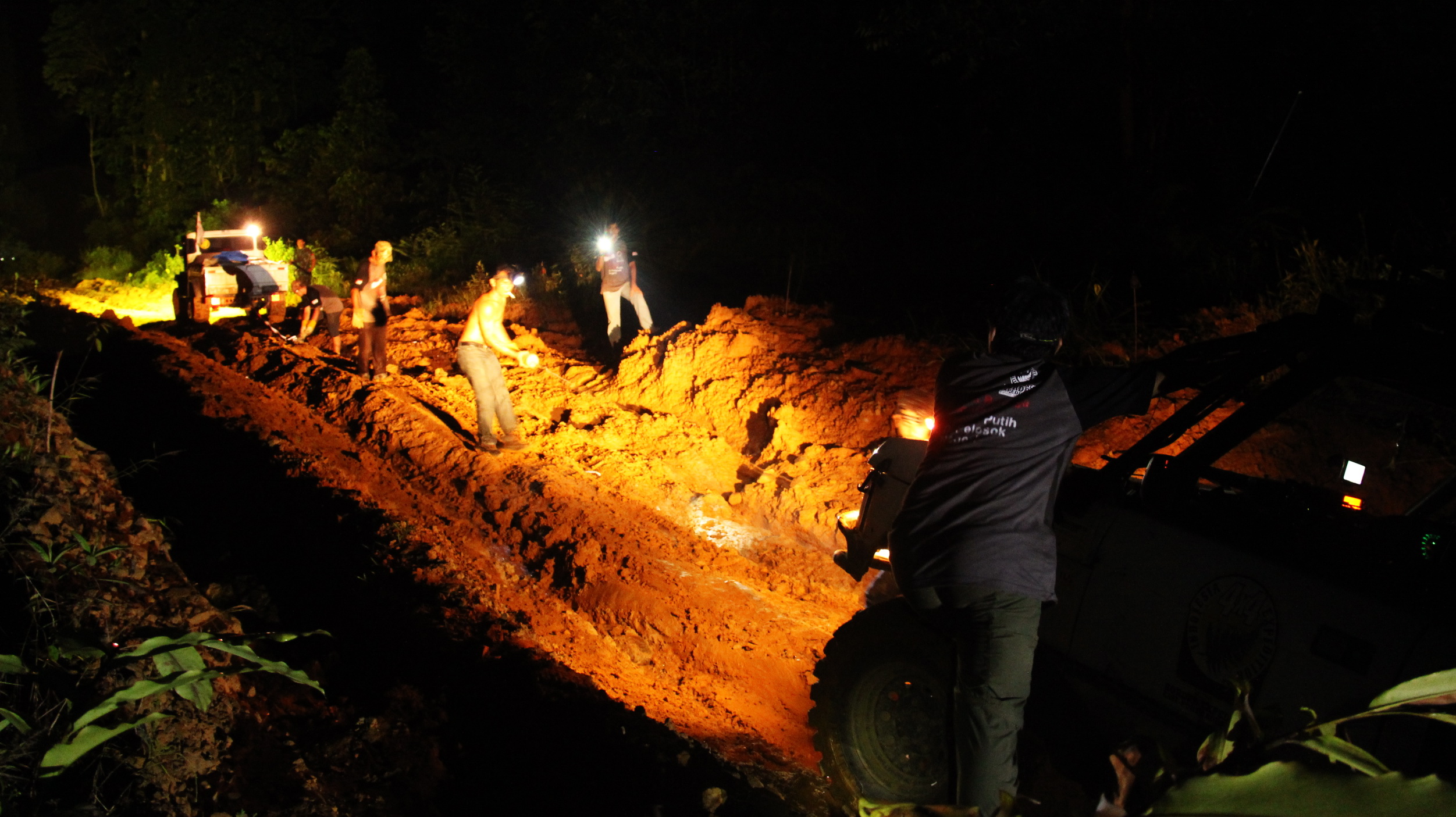 “Nanti habis pengobatan ini, mungkin kita baru ada offroad sedikit,” kata Insuhendang, surveyor tim. Jalan ke Pos Siluman adalah jalan bekas perusahaan penebangan kayu dengan kontur naik turun. Seperti biasa, jalan seperti itu juga rawan longsor dan penuh tanah liat yang licin bila hujan.