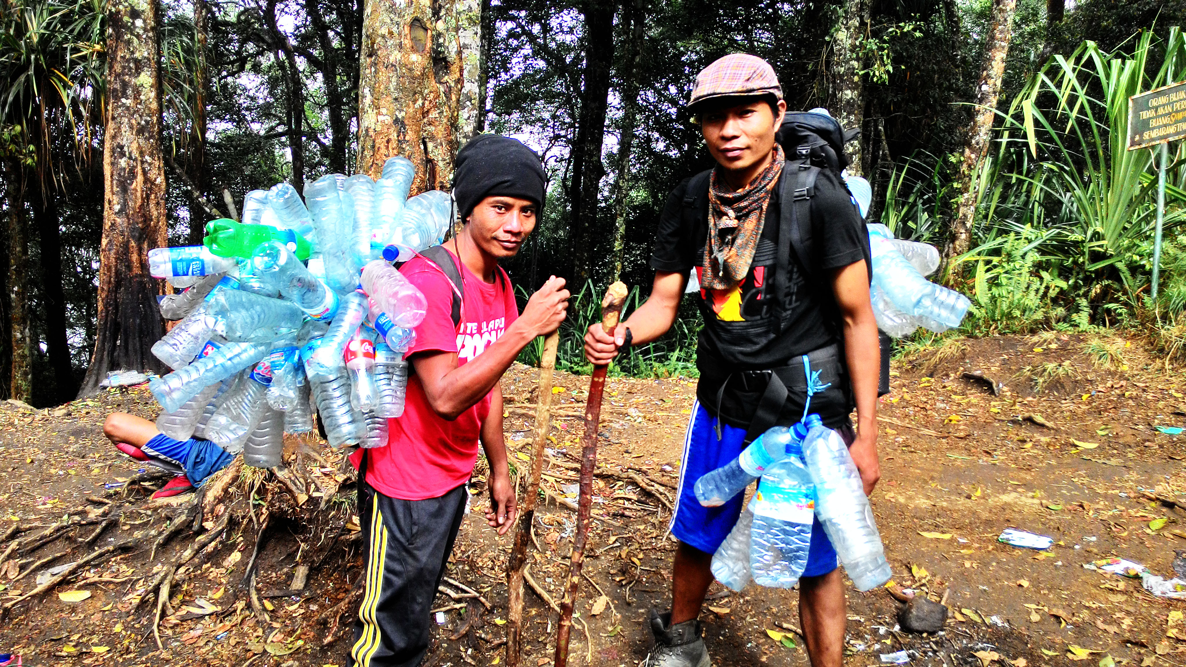 Semua pun siap. Saya juga berpamitan pada Adim dan Dedi, dua pemuda yang dengan sukarela memunguti semua botol plastik yang dibuang orang sepanjang jalan. Mereka mendapatkan masing-masing tak kurang dari seratus botol. Botol-botol itu diikat di bagian lehernya dan dirangkai jadi satu. Adi dan Dedi mengikat lagi bundelan botol itu di ranselnya, yang membuat mereka jadi seperti landak dengan duri berwarna putih.