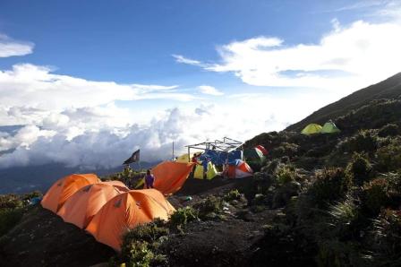Kubah tenda-tenda yang berwarna-warni berkumpul di tengah Shelter 3, lereng Kerinci di latar kiri, dan langit putih berawan di atasnya.